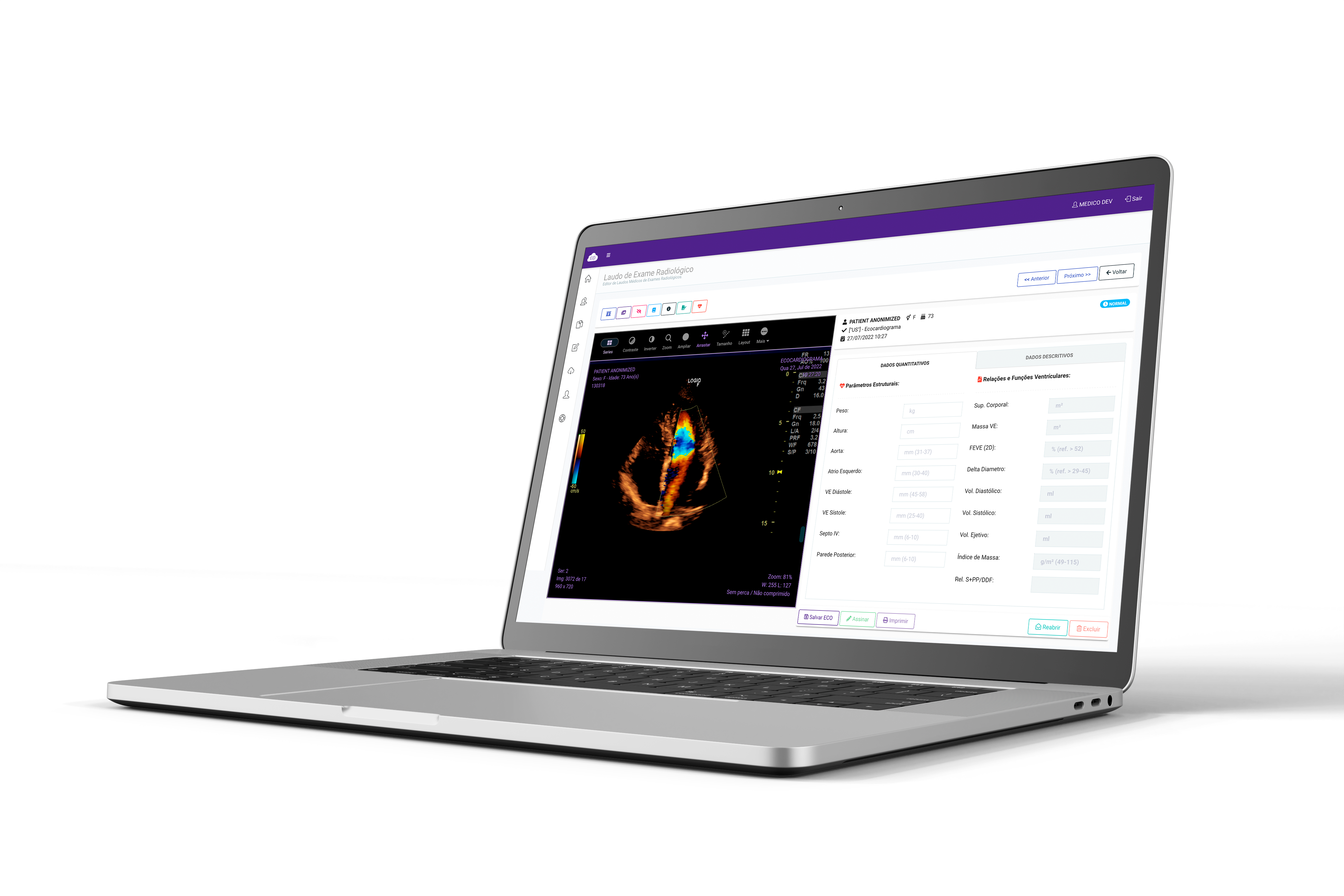 A ferramenta de laudos para ecocardiograma permite quantificar os parâmetros estruturais e calcular a relações e funções ventriculares possibilitando a representação dessas informações no laudo.